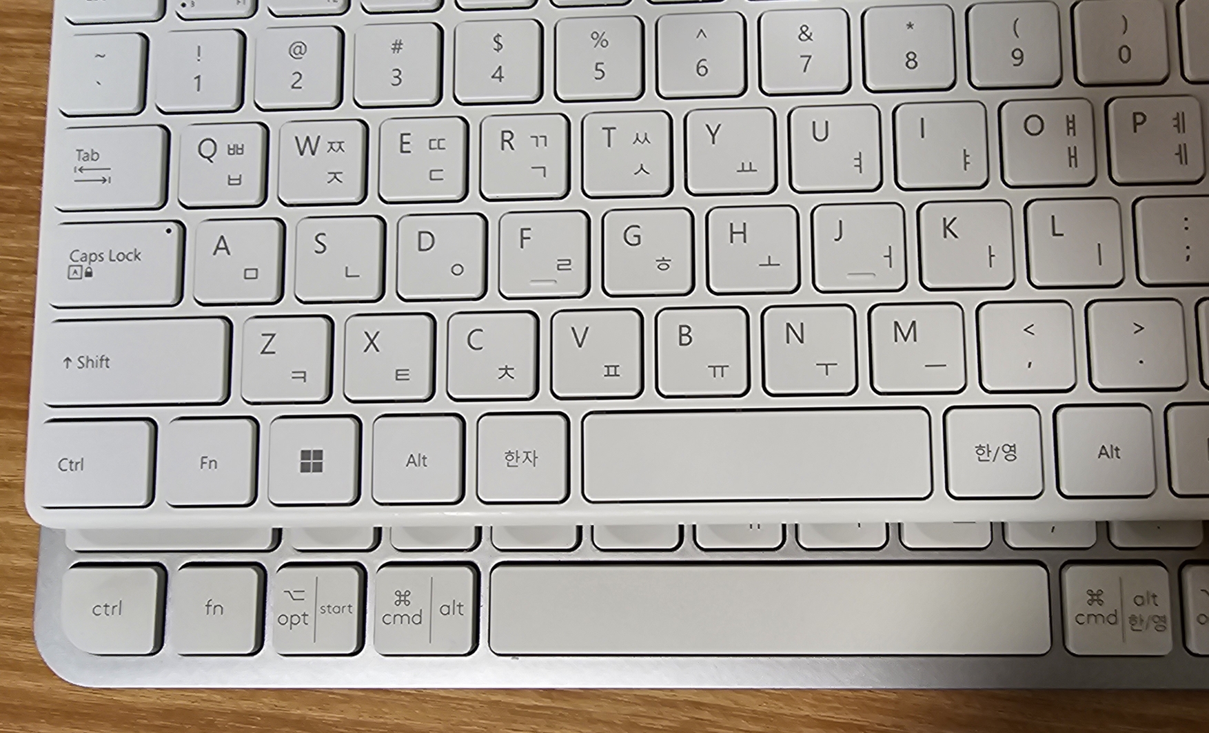 다른 키보드들과 한영키를 비교해 보았다. 내가 가지고 있는 어떤 키보드도 이렇게 한영키가 < 보다 내측에 있는 키보드가 없었다.
