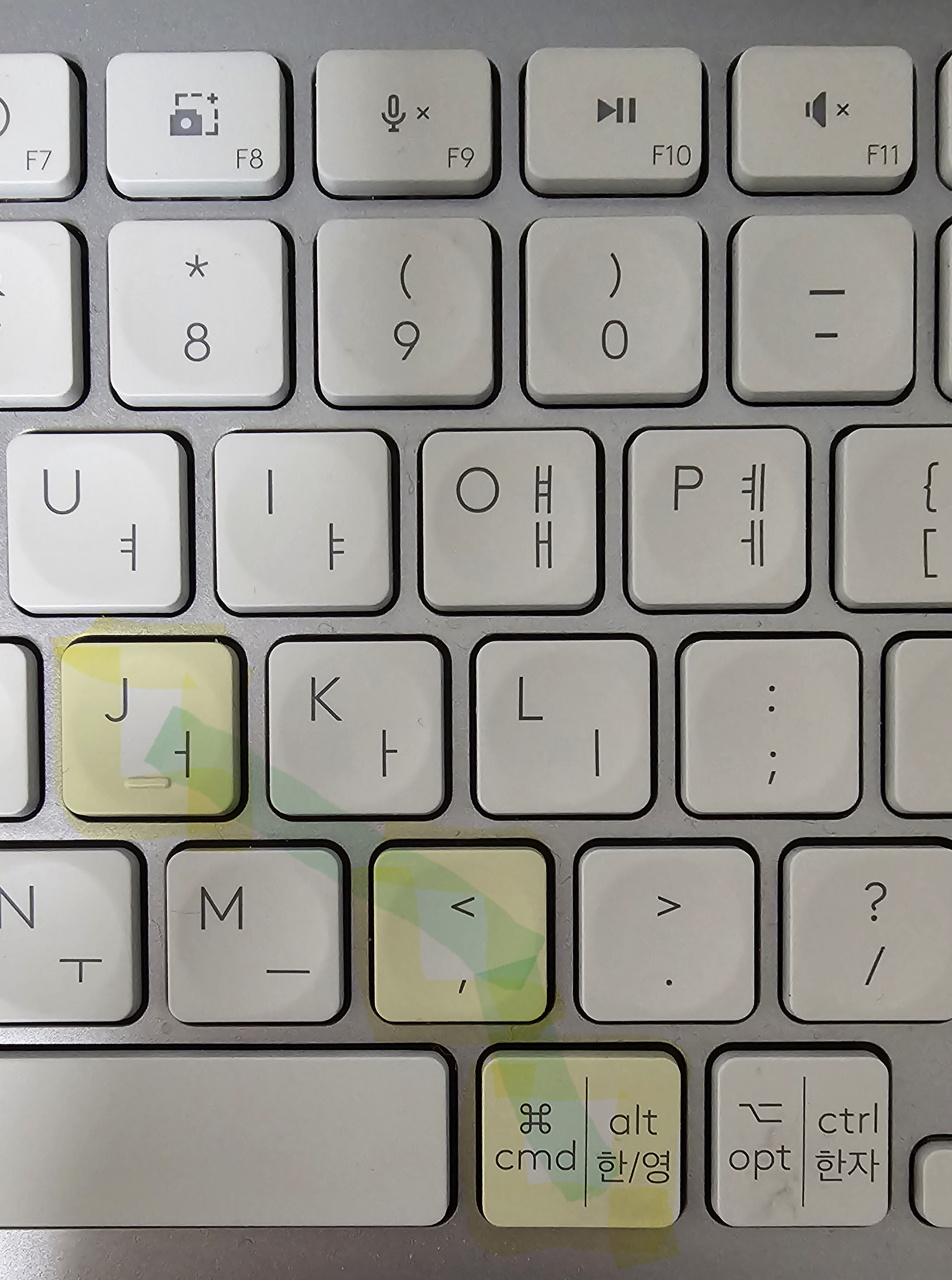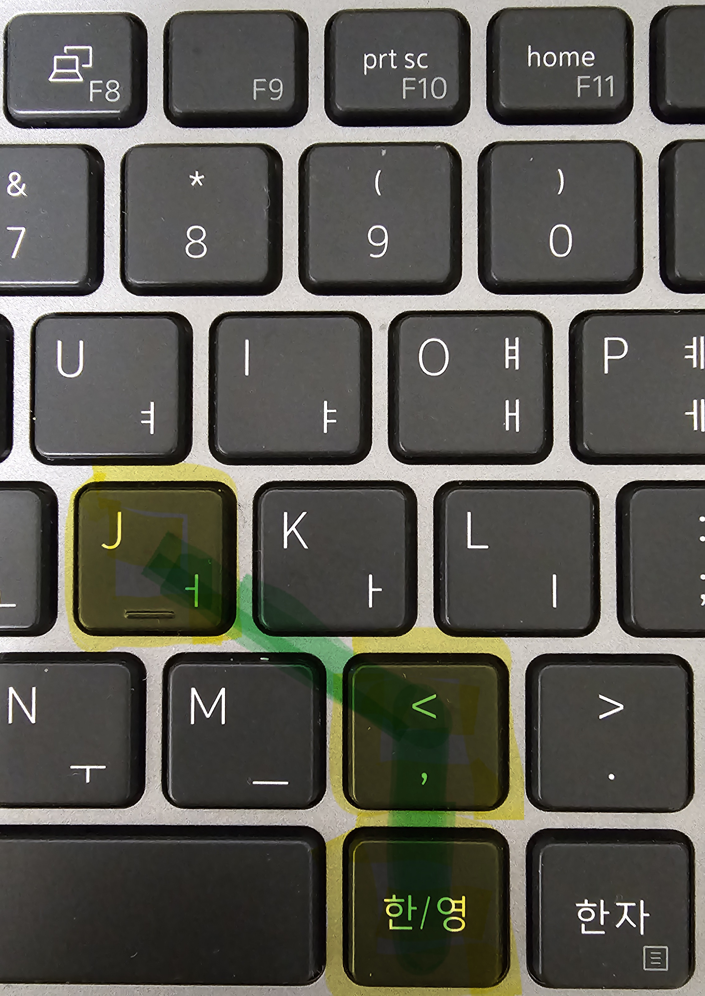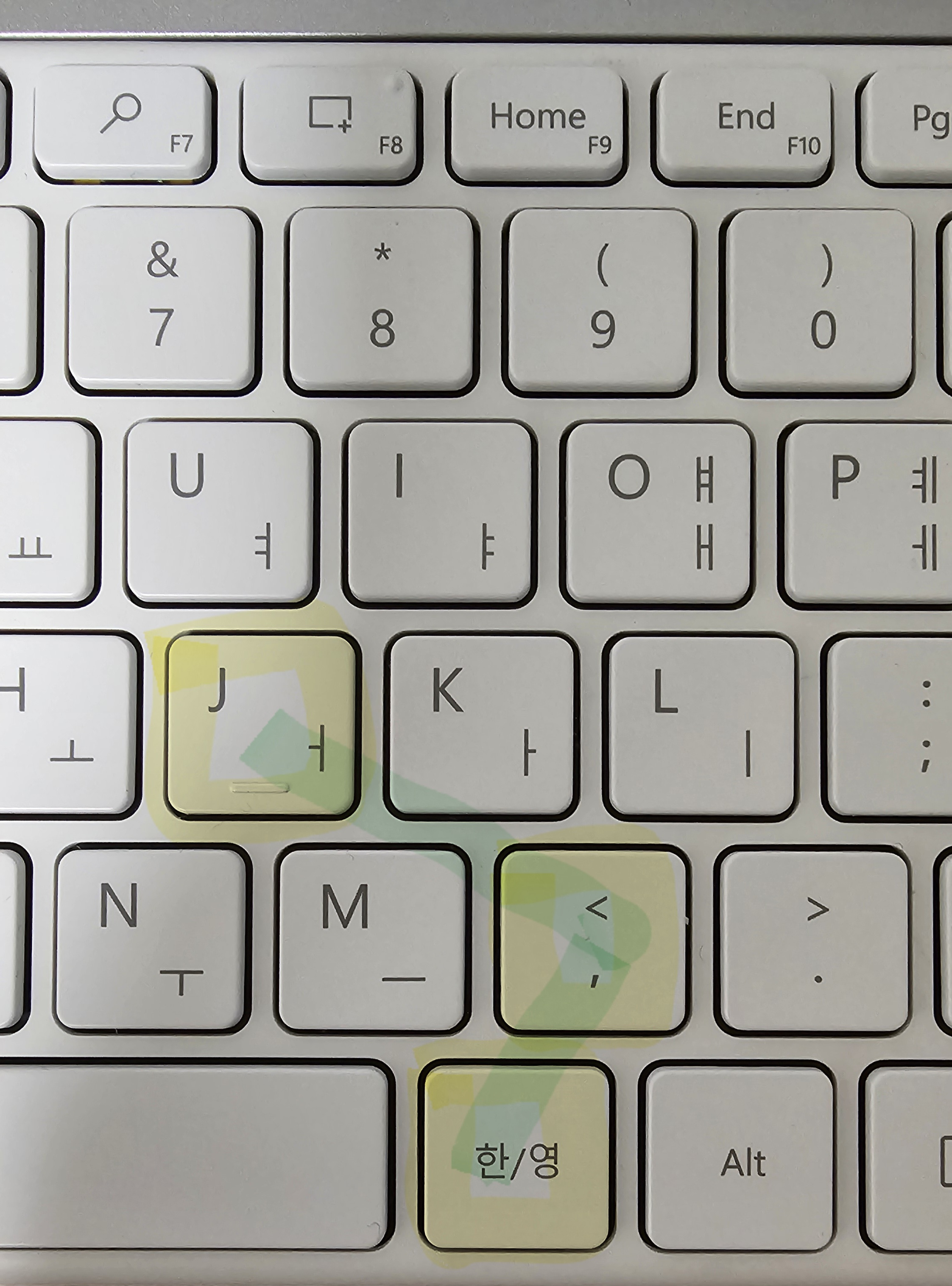 이 키보드의 한영키 Alt 키가 얼마나 이상한 위치에 있냐면, 키보드 손 정렬의 기준이 되는 J 키를 기준으로 한영키와 가장 가까운 < 키와의 정렬을 선으로 그으면 이런 모양이다.