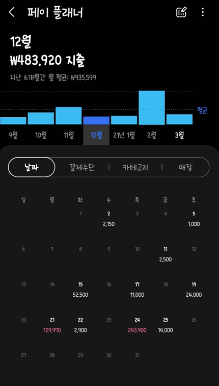 페이플래너 기능도 아주~ 요긴하게 사용하고 있어요. 할부와는 별개로 내가 이번 달 사용한 돈을 날짜별로 파악할 수 있어 아주 좋습니다. 하루하루 무지출데이가 늘어갈때 마다 아주 뿌듯해요.